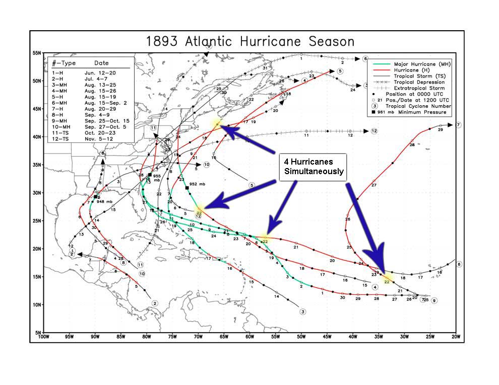 On this date in 1893...there were four hurricanes in the Atlantic Basin. It would be over a century before this would happen again in 1998. One of these storms eventually made landfall near Savannah as a Cat 3 hurricane on August 27 - the Great Sea Islands Hurricane.