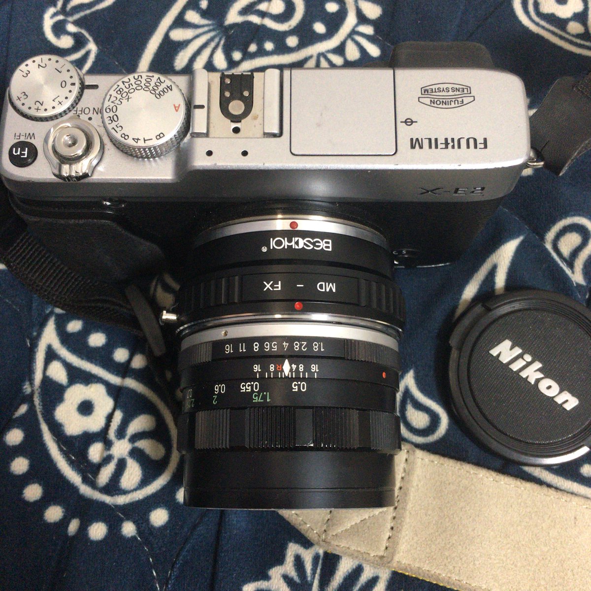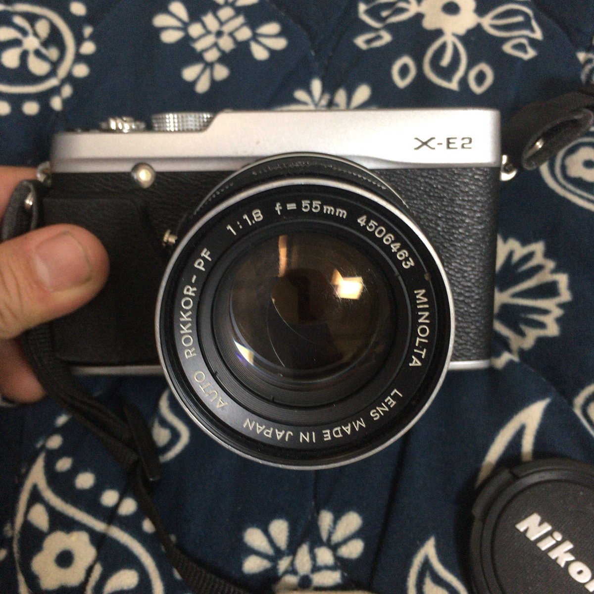 マウントアダプターを介して富士フイルムX-E2にMINOLTAの緑のROKKORレンズを装着。 レンズカバーがNikonなのはご愛嬌(笑)