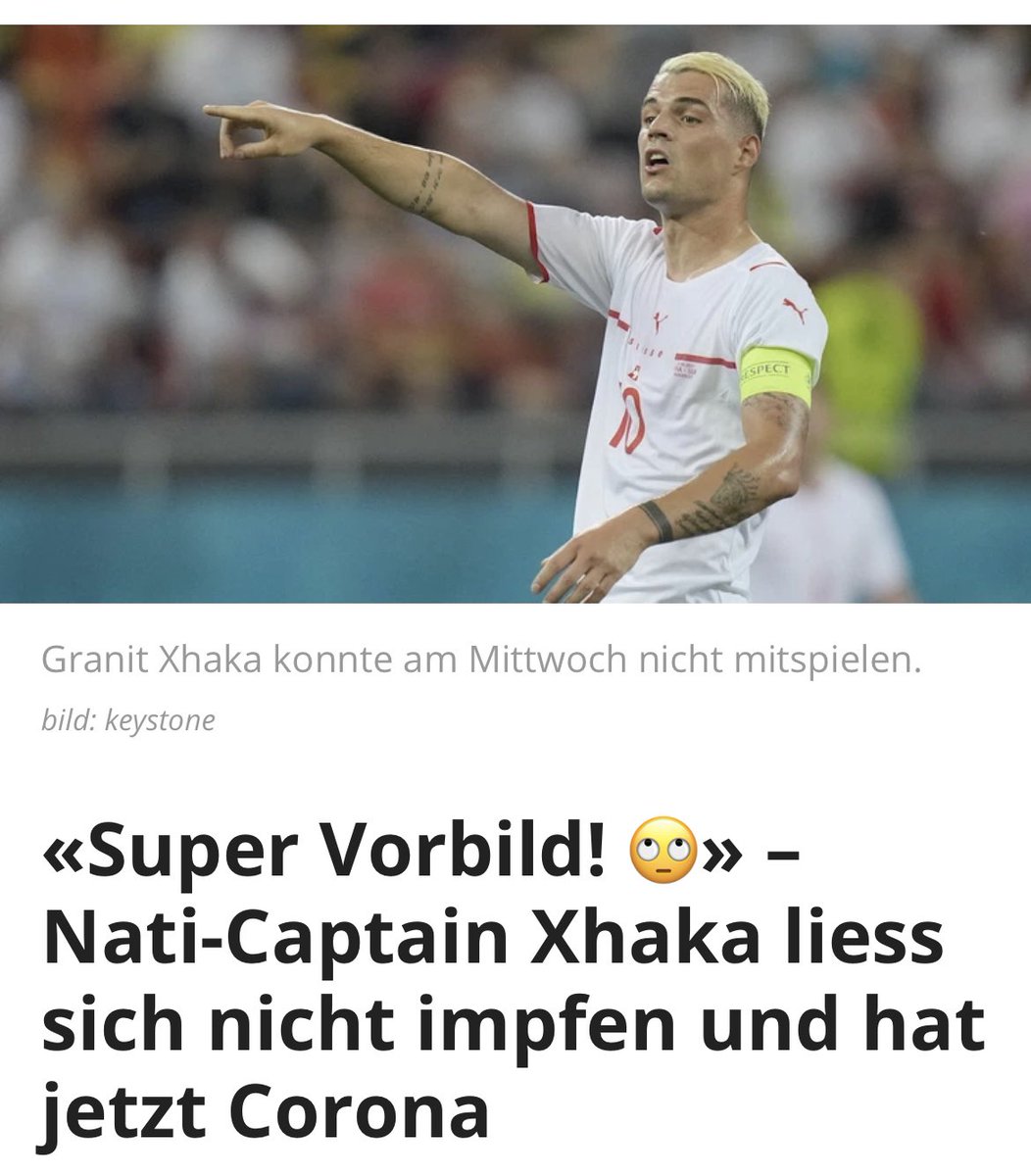 #Xhaka. Aber dass er, der Captain der Schweizer Nationalmannschaft, die so viel Goodwill und so viel Spezialbehandlungen geniesst in dieser Pandemie, nicht geimpft ist, ist ein Skandal. -
