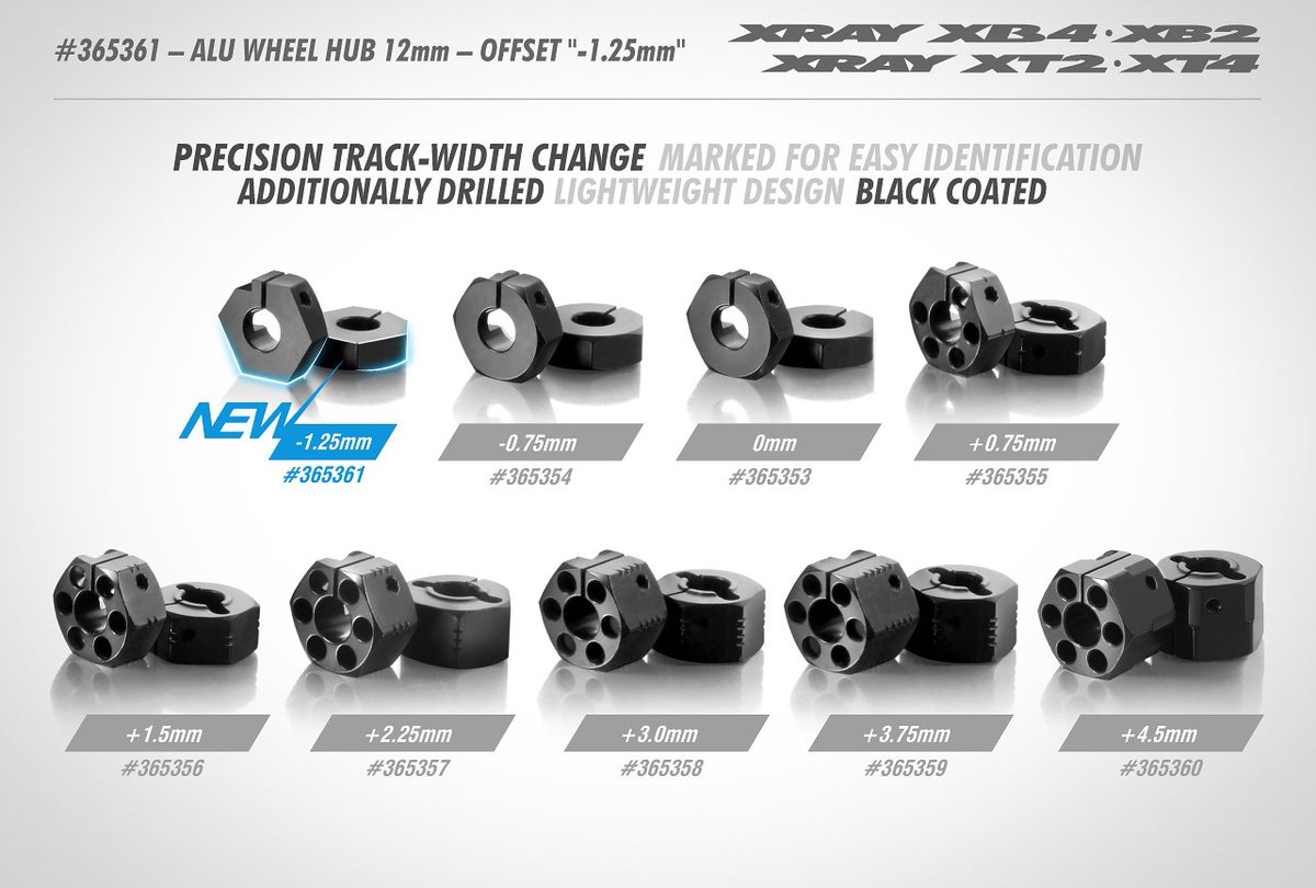 New Alu Wheel Hub 12mm - Offset "-1.25mm" (2) •Precision track-width change •Marked for easy identification •Additionally drilled •Lightweight design •Black coated Fits all XB2 & XB4 & XT2 & XT4 #365361 Alu Wheel Hub 12mm - Offset "-1.25mm" (2)