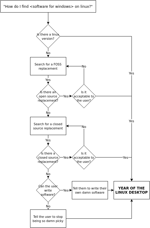 I made a flowchart for helping windows users find software for linux.