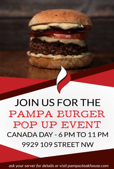 #yegdt for#CanadaDay2019 festivities? Join us for a#Pampa#Burger to-go! July 1st 6-11pm, 9929-109 Street NW#yeg. https://pampasteakhouse.com/location/downtown/ …#CanadaDay#EatPampa#yegfood#yegevents@EdmontonChamberpic.twitter.com/yCApN3gF0Z