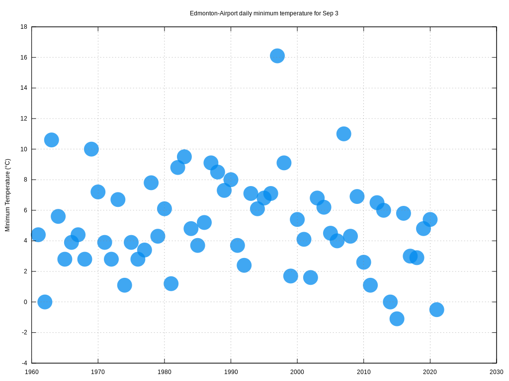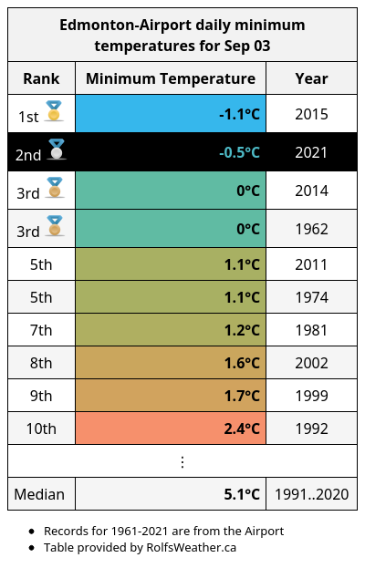 Today's ~8am low of -0.5°C is the 2nd lowest temperature Edmonton-Airport has recorded on Sep 3rd since records began in 1961. #yegwx pic.twitter.com/ufHRYO6JJm