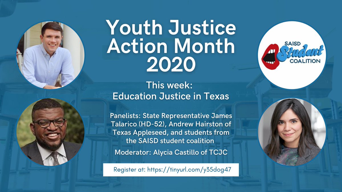 #YJAM with our largest panel yet! Please join TCJC's@alycia_castillo along with TX Rep. and former teacher@jamestalarico,@AndrewRHairston of@TexasAppleseed, and students from@saisdstudentco for a conversation on education justice! http://tinyurl.com/y35dog47 pic.twitter.com/IXhuhA0pEt