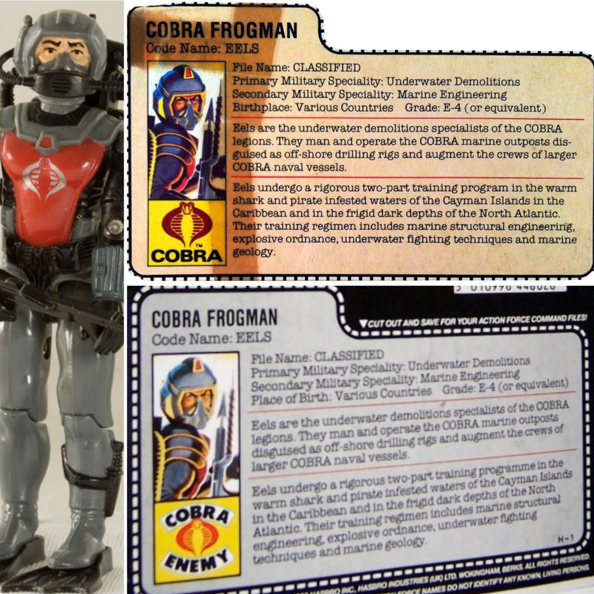 @Diagnostik80 talked about these guys! 1. Eels v1 U.S. 1985, U.K. 1987 2. File cards U.S. top, U.K. below 3. Card backs 4. Action Force Weekly issue #2 cover#gijoe#yojoe#actionfigures#hasbro#eels#toyspic.twitter.com/C0XKNeseXl