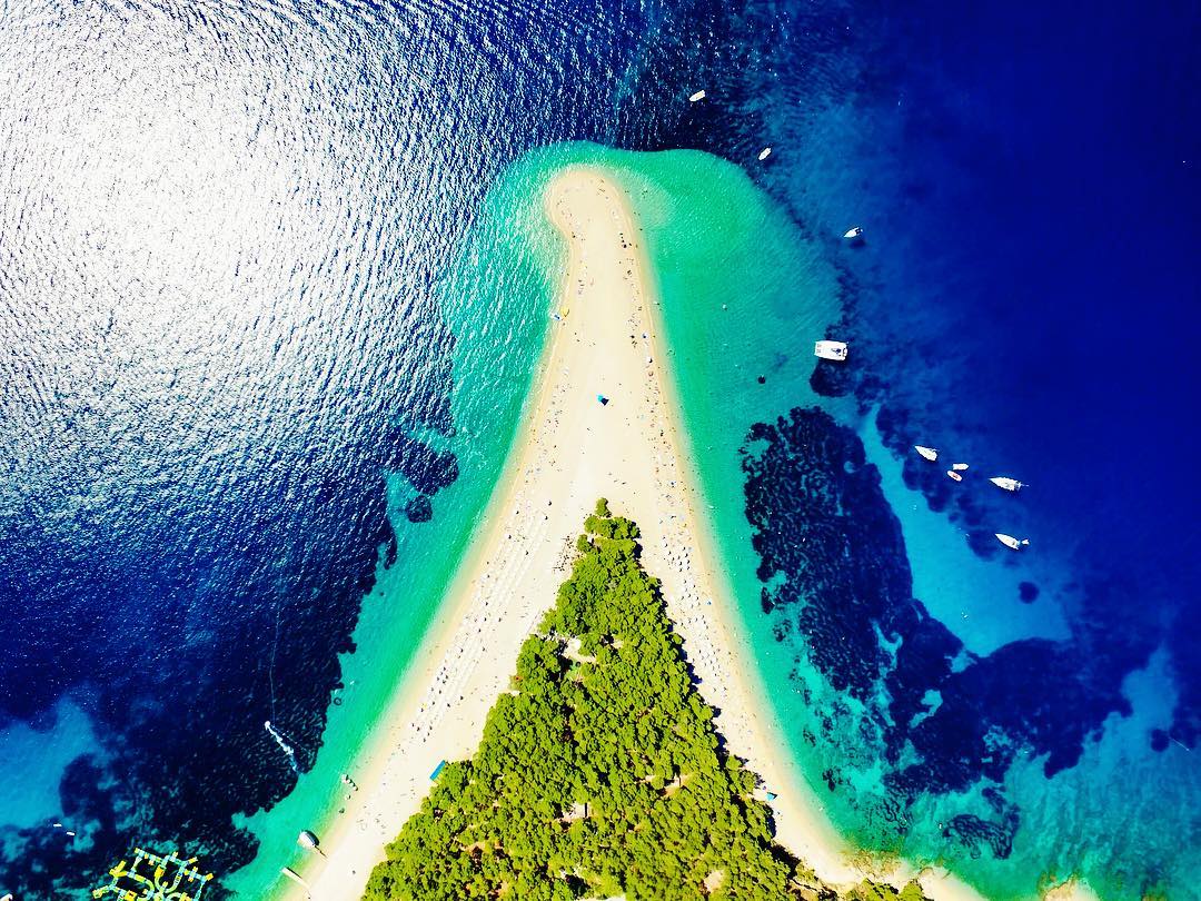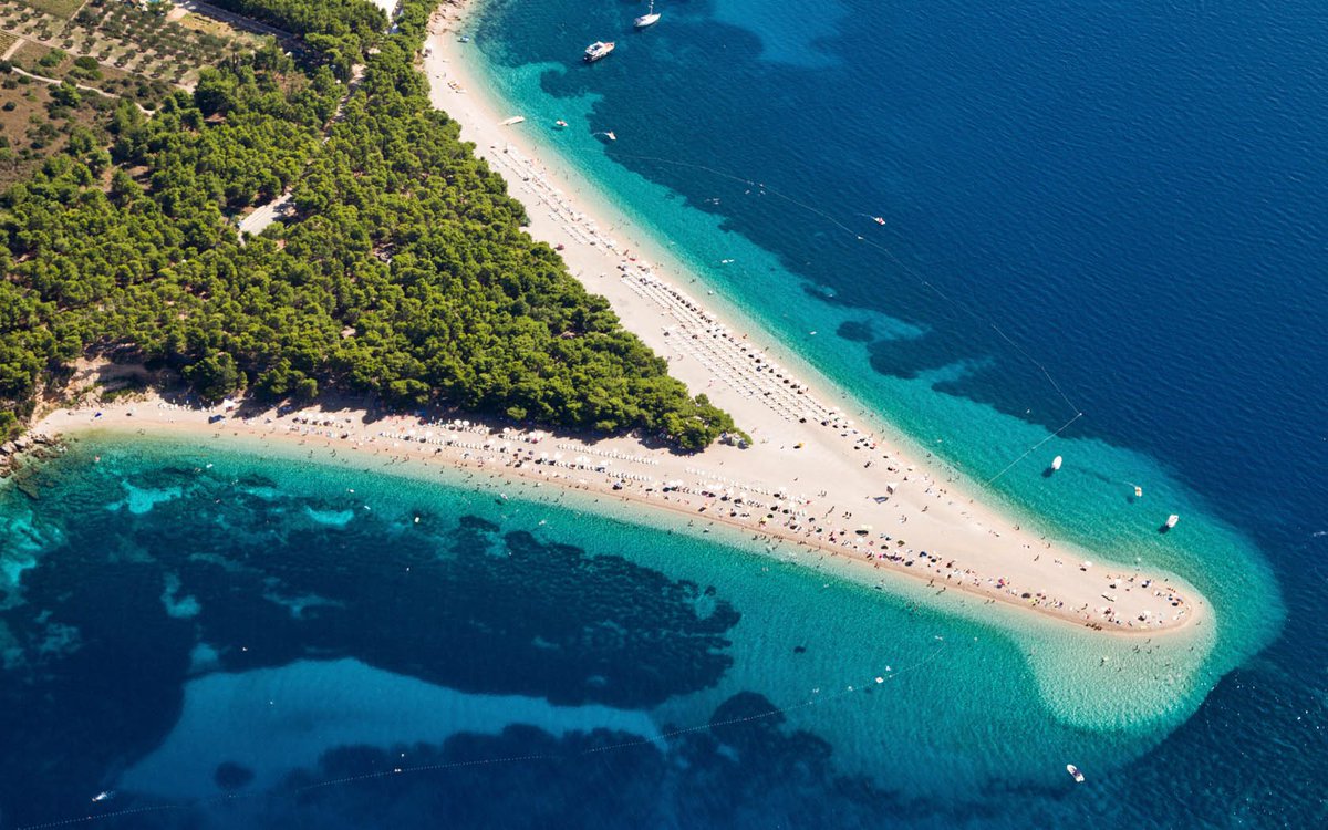#ZlatniRat,#Brač La playa más fotografiada de#Croacia se extiende como un "cuerno de oro", como su nombre lo indica. Presume un bosque de pinos mediterráneos y unos guijarros tan finos que parecen arena