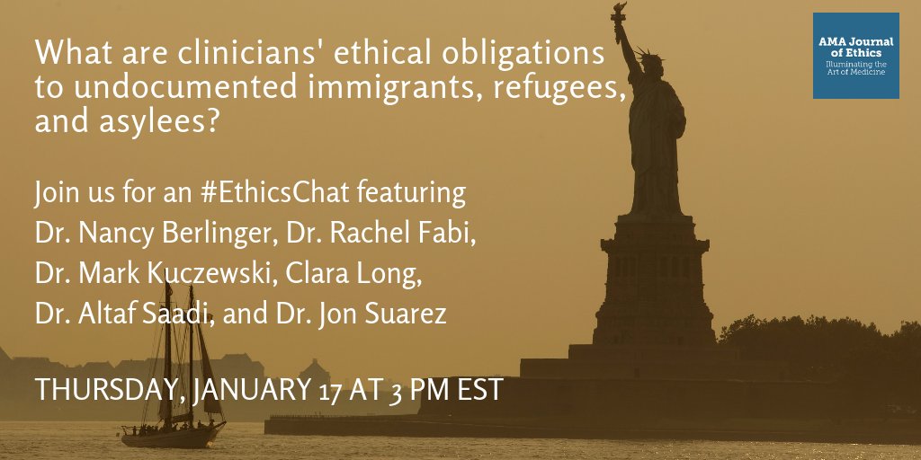 #EthicsChat on 1/17 on care for undocumented immigrants w/ an *amazing* slate of experts, incl@BioethxMark@clarychka@JonJSuarez@faBioethics@AltafSaadiMD@hastingscenter@dibartoloim. Join us to learn & share insights on this critical topic!pic.twitter.com/1gFFMOsXHt