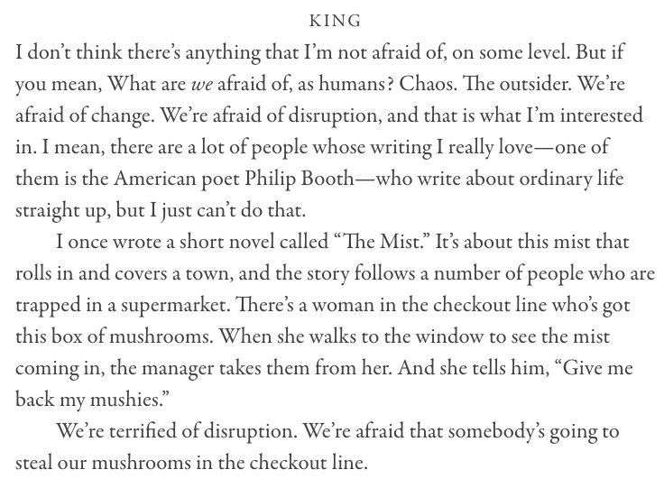 In 2006 The Paris Review asked Stephen King what he thinks we're afraid of. https://www.theparisreview.org/interviews/5653/stephen-king-the-art-of-fiction-no-189-stephen-king …?pic.twitter.com/r0K7TKUUcR