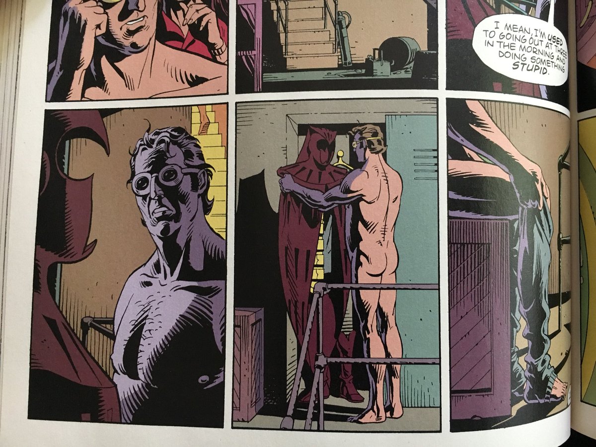 One of my favourite things in Watchmen is the deeply human and pathetic scene where Nite Owl puts his superhero costume on. My heart.pic.twitter.com/oWoNsGNC7y