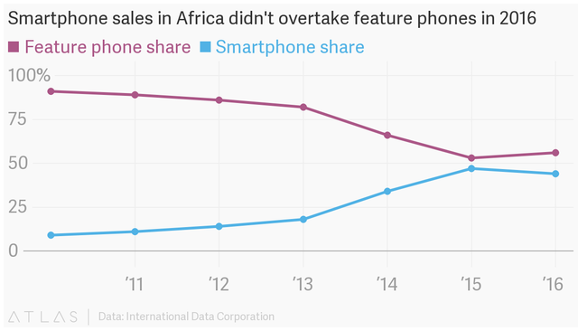Suprisingly, smartphone sales didn't overtake feature phones last year in Africa. Source,
