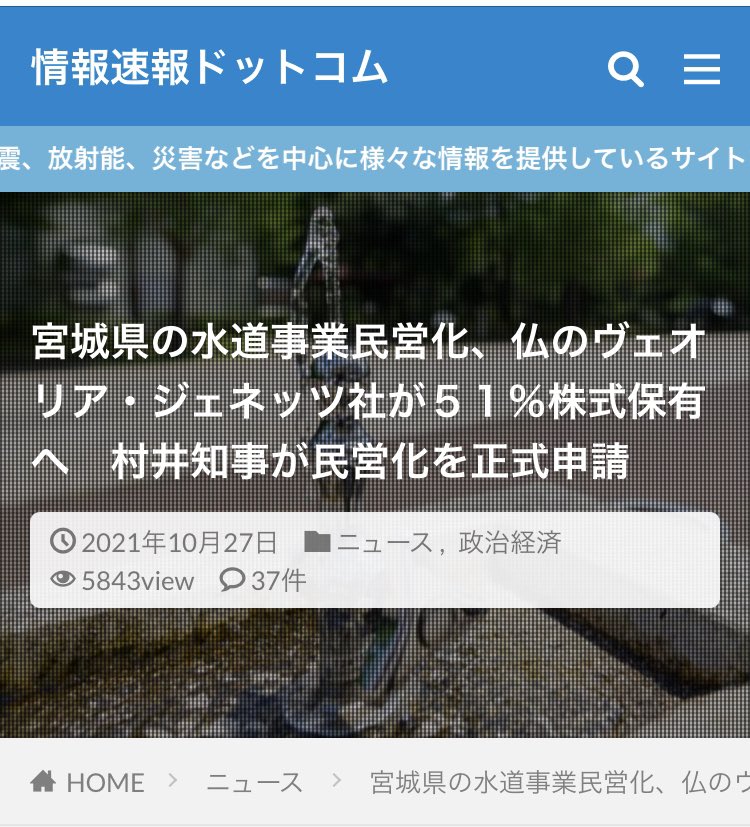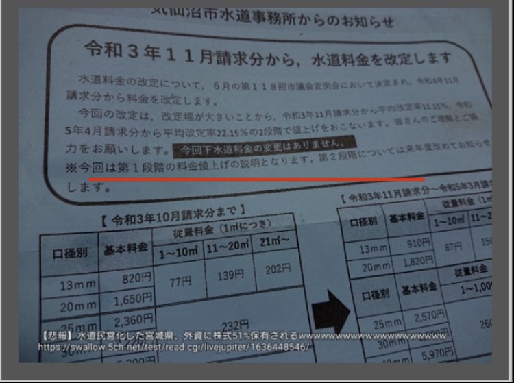 遂に、宮城県で水道が民営化、ヴェオリアに。 早速水道料金が20%以上値上げ これは第一段階で、第二段階は来年度にすると これでもし災害が起きた場合 今までなら被災地には無料で配られた水も有料になる 水質基準も勝手に変え 海外のように飲み水として使えなくることも考えられるpic.twitter.com/iOYmiLNNEB