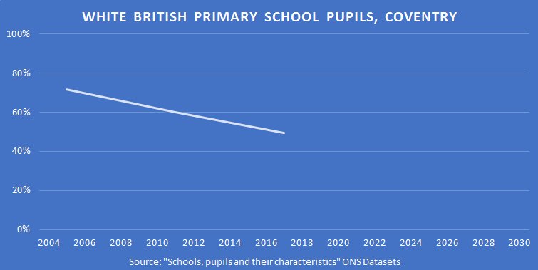Coventry's primary school population was 49% White British in 2017, down from 60% in 2011 and 72% in 2005.