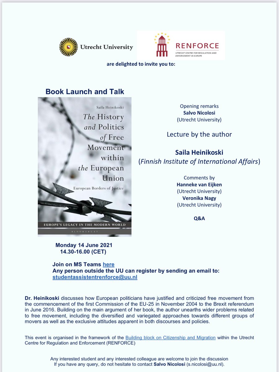 @BloomsburyAcad monograph at a book launch event organised by@UU_RENFORCE at@UniUtrecht on 14 June at 14.30 (CET)/15.30 (EET)! For registration, please see the email in the flyer below. Read more and get your own copy: https://www.bloomsbury.com/uk/the-history-and-politics-of-free-movement-within-the-european-union-9781350150546/ …pic.twitter.com/394nyXTkxn
