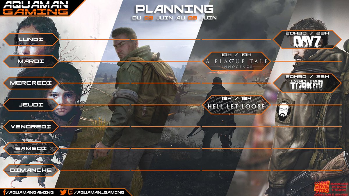 La planning de cette petite semaine. http://www.twitch.tv/aquaman_gaming  @APlagueTale #APlagueTaleInnocence #EscapeFromTarkov #Tarkov @BetaEFT @bstategames @hell_let_loose #HLL @DayZ #DayZ #twitch @Twitch @TwitchFR #planningpic.twitter.com/n0GaDBx0Xz