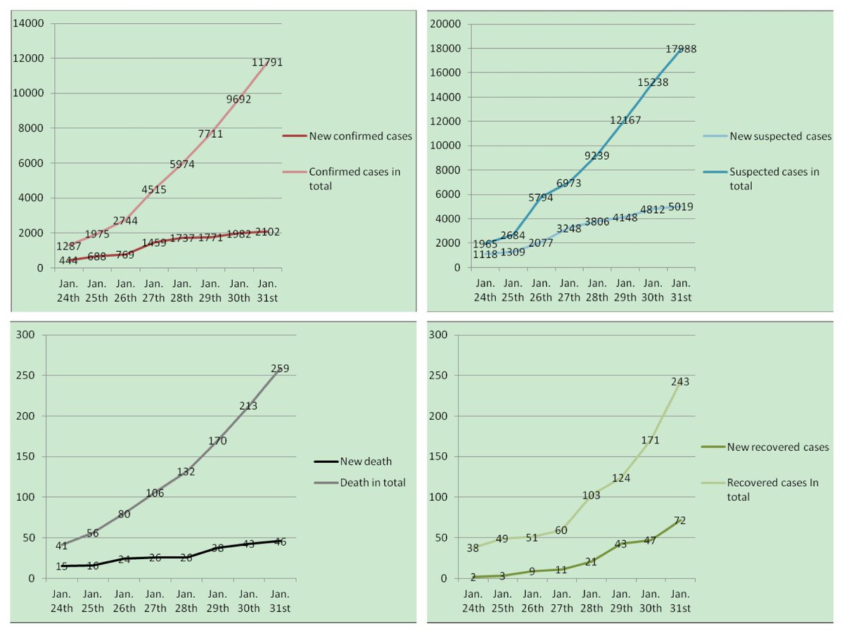 Daily Updates of coronavirus figures in China. To date in total, 11791 confirmed, 17988 suspected, 259 deaths and 243 recovered. Newly recovered ones begin to surpass new deaths figure.