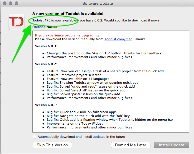 Todoist 175 upgrade? Upgrade notification from THE FUTURE!!! Cool!