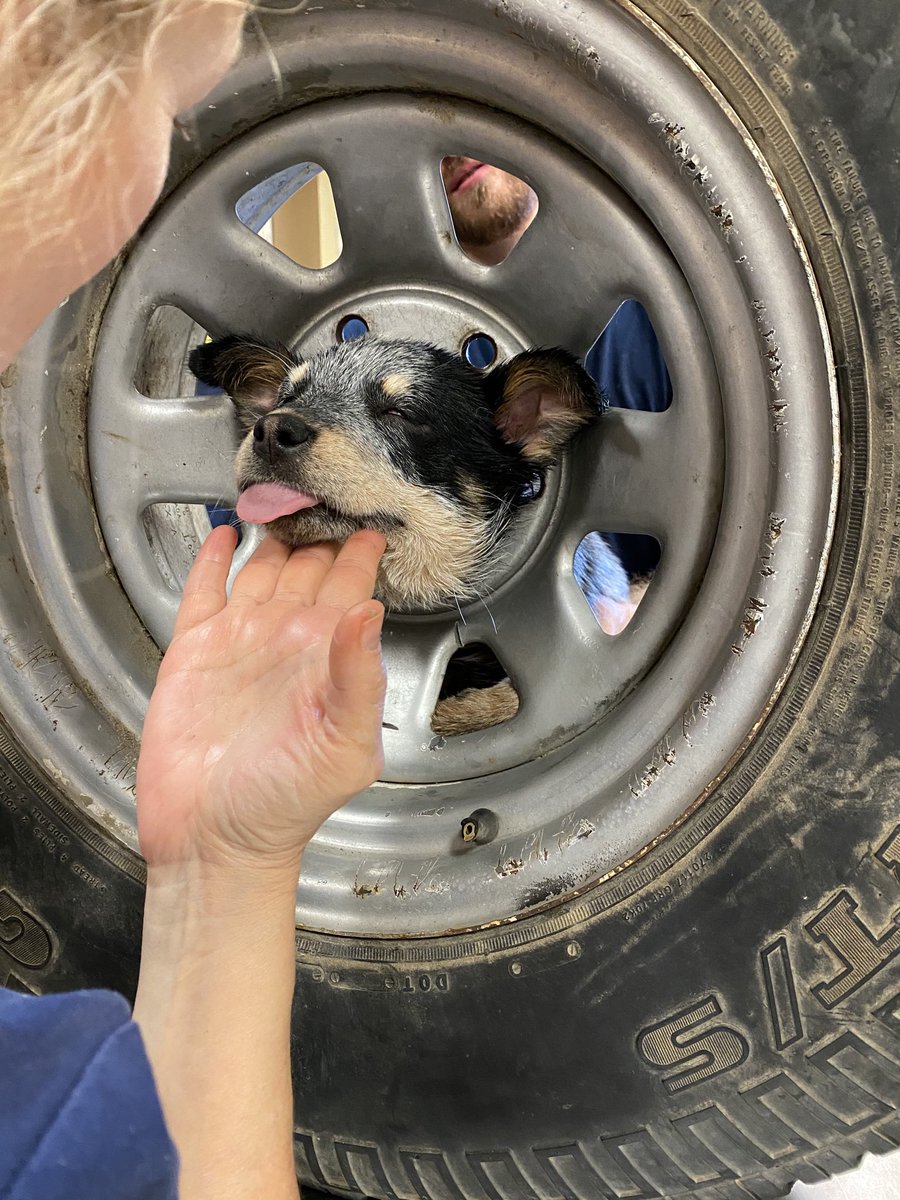 Breaking news: we are doing all we can to assist this pup. She got herself stuck in this spare tire in