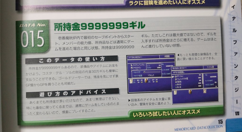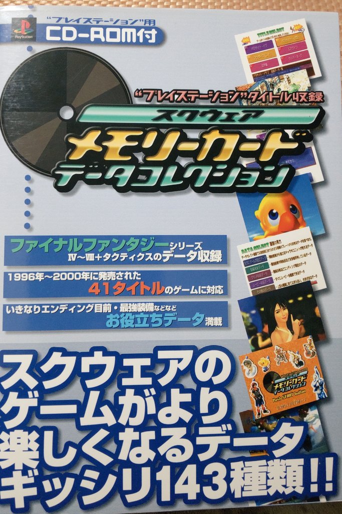 本棚を整理してたら、すごく懐かしい本が出てきたw スクウェア メモリーカードデータコレクション。 FF、クロノ、サガ、ゼノギアスなど初代プレステで出たスクウェアゲームの便利データがたくさん入ってる本。 公式チートにもほどがあるwpic.twitter.com/QuADkiBAJe