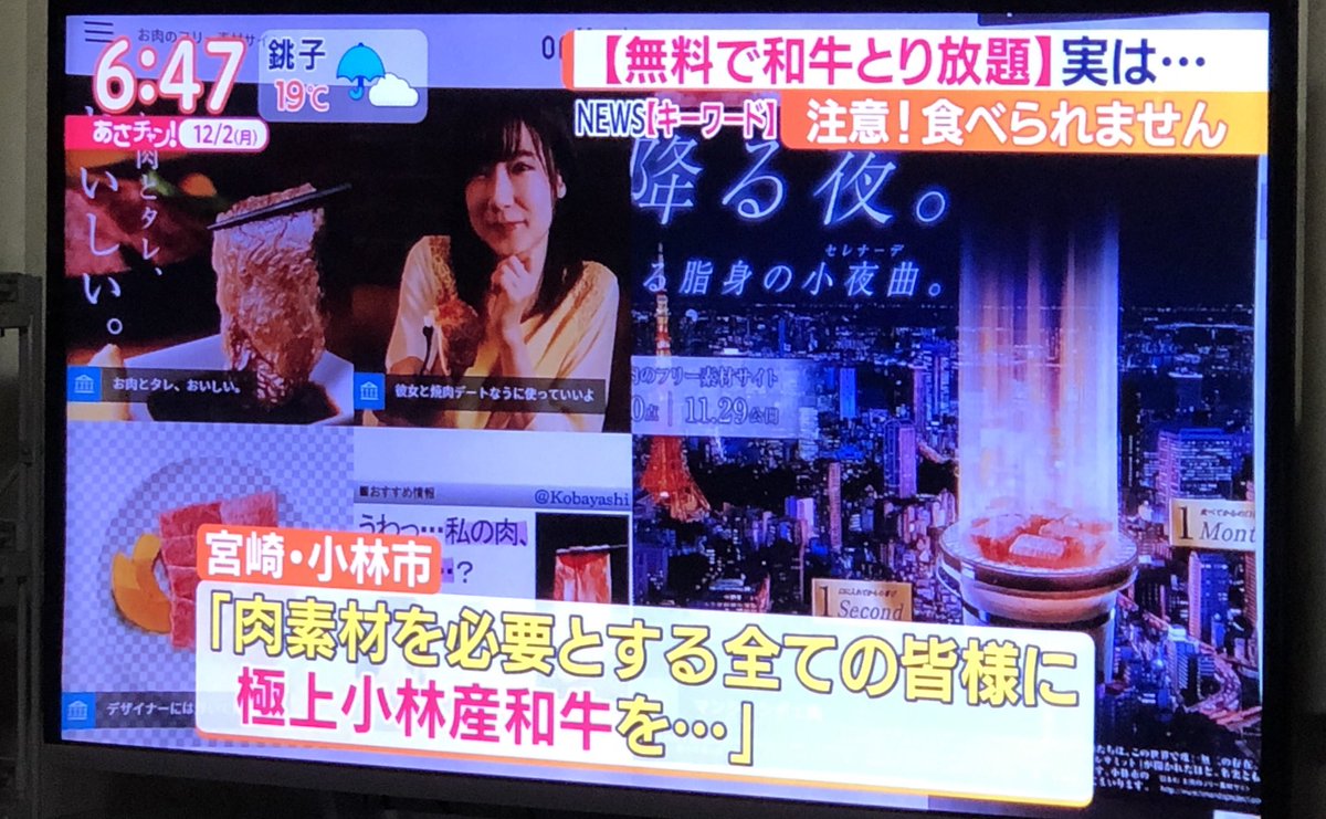 今朝12/2の「朝チャン!」で、宮崎県小林市のユニークな取り組みが紹介されてました!「無料で和牛とり放題」!写真じゃ満足できない方は「小林市ふるさと納税」でゲットしてくださいませ!
