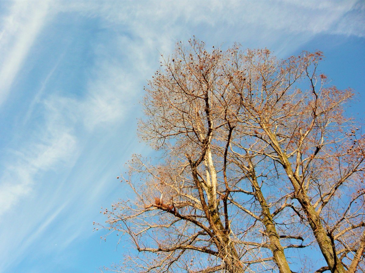 今日もいいお天気! 葉の落ちたラクウショウは実が目立ちます。植物園、宿根草園にて。