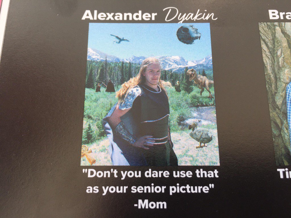 Don't you dare use that as your senior picture https://www.reddit.com/r/funny/comments/6fed49/best_senior_quote_and_picture_in_my_yearbook/ …