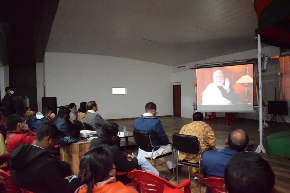 @narendramodi. Watching Adarniya PM's interview at@BJP4Manipur office along with Karyakartas, Hon Union MoS Smt@PratimaBhoumik; Min Sri@TheAshokSinghal; Manipur Prabhari Dr@sambitswaraj; & President Smt@AShardaDevi.pic.twitter.com/JeEpDQttC7