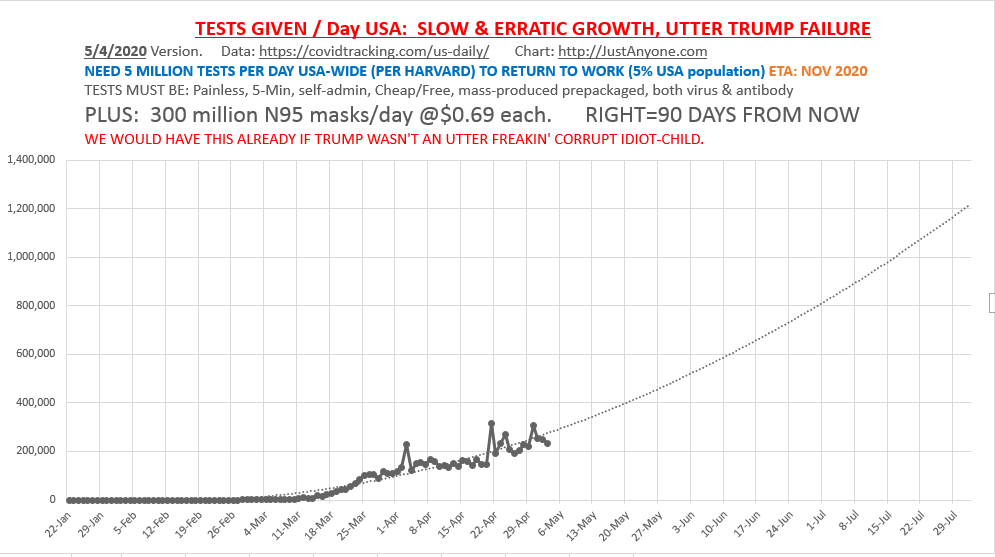 to reopen, you need: TESTS, 5 MILLION A DAY NATIONWIDE, and MASKS, one per worker per day, about 100 million a day, at 69 cents each in quantity, if we would build the machines to make them. Will we? Ever!?!? We'll need them for the next 2 years at least. NOW? TESTS!pic.twitter.com/UZq8q6ourd