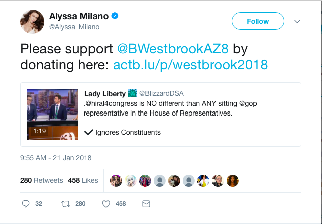 Here's Alyssa Milano tweeting the same. The story is in the Arizonan news if you feel like researching it. Brianna Westbrook, a transgender woman who is also a member of the Democratic Party, is being pushed out of the primary by a law suite filed by Hiral's friend.pic.twitter.com/jatZSsZ5YE