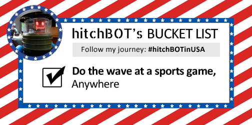 #hitchBOT bagged 1st bucket list item! Started#thewave in our box @ Fenway#OnToTheNextOne@hitchBOT#hitchBOTinUSApic.twitter.com/JzD7Au5PPX