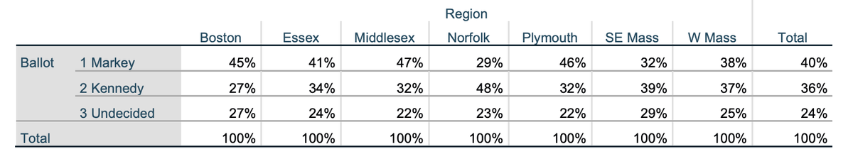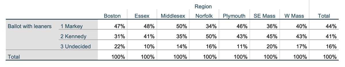 Region: Without leaners, Kennedy holds the advantage in Norfolk and Southeast Mass. He leads in Western Mass 43-40% when leaners are included. Undecideds remain a major factor in this race, with Markey cracking 50% only in Middlesex when you include leaners.pic.twitter.com/3IsyHZrwXy