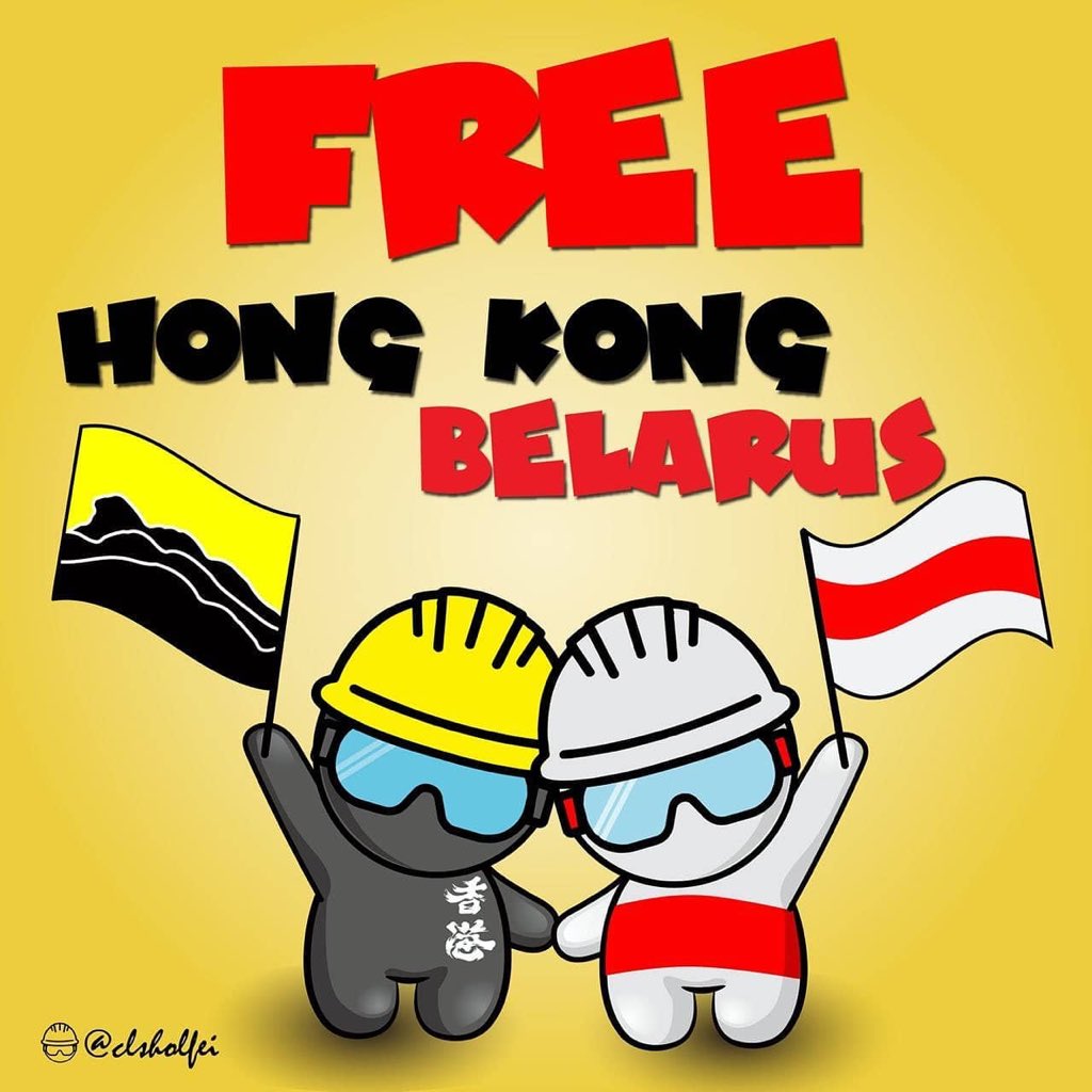 A lot of art of HKers in frontline gear (gas masks and helmets) and Belarusians in daytime protest clothing - maybe due to how media coverage for the two different movements tend to focus on these respective visuals. Submissions by @siilvalta, @SiuAnda, @fbisannn, and @MenSuenpic.twitter.com/8oGqqDpG2i