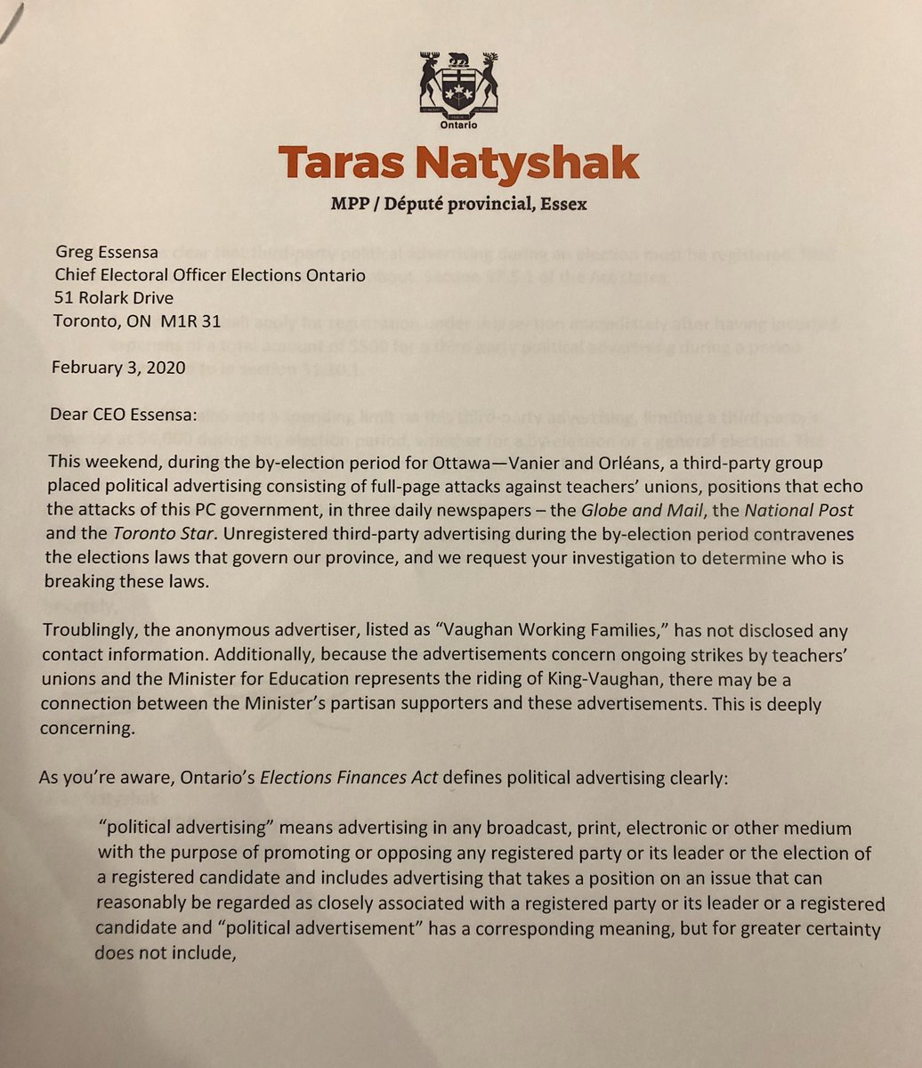 NDP ethics critic Taras Natyshak wrote to Chief Electoral Officer Greg Essensa demanding a probe into the Vaughan Working Families ad campaign attacking teachers unions. Natyshak argues it constitutes 3rd party advertising in a byelection period + $ must be disclosed