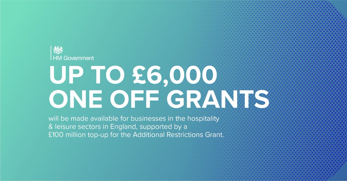 New grants of up to £6,000 per premises will be available for hospitality and leisure businesses in England – alongside a £102m top-up for the Additional Restrictions Grant to help businesses impacted by Omicron this winter. Find out more: https://www.gov.uk/government/news/1-billion-in-support-for-businesses-most-impacted-by-omicron-across-the-uk …pic.twitter.com/AvXcfIGwxb