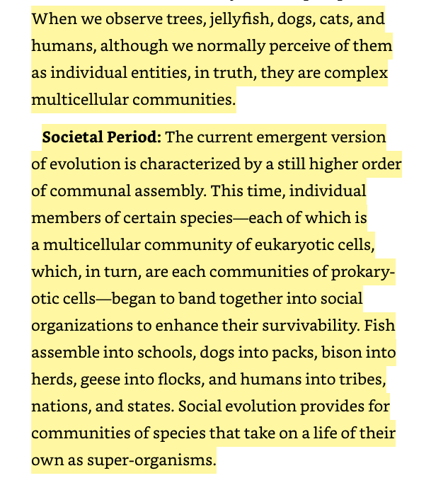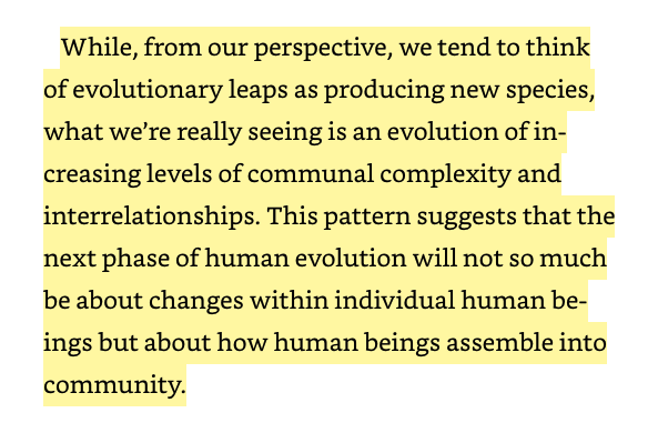 I'm reading the book Spontaneous Evolution and I'm in the part where it talks about the future of humanity and our survival depends on our ability to form a community with one another. Enlightening book, recommend.pic.twitter.com/ouoYfPvTi8
