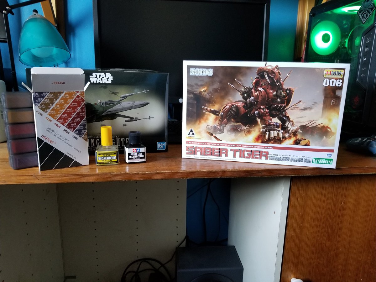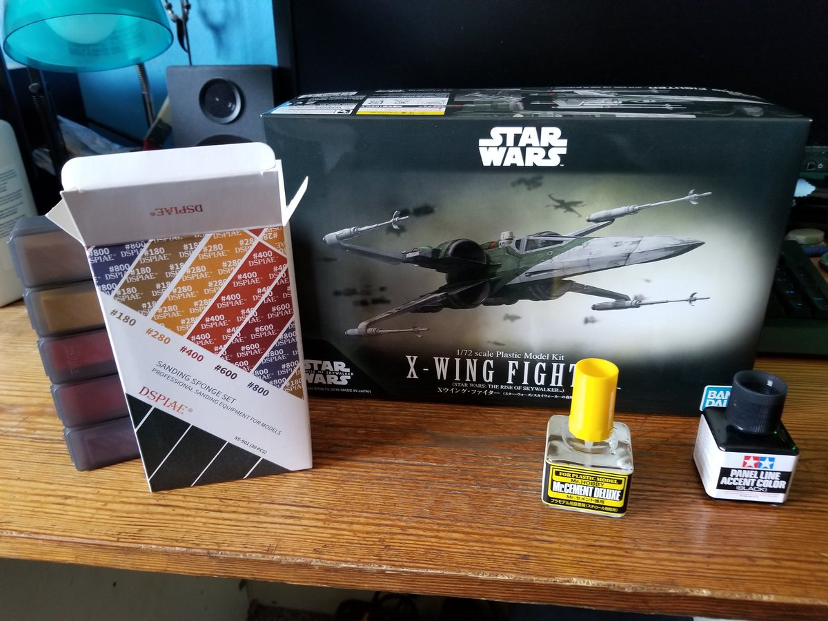 My Birthday haul. 1/72 X-Wing, panel liner, cement, and Dspiae sanding sponges from