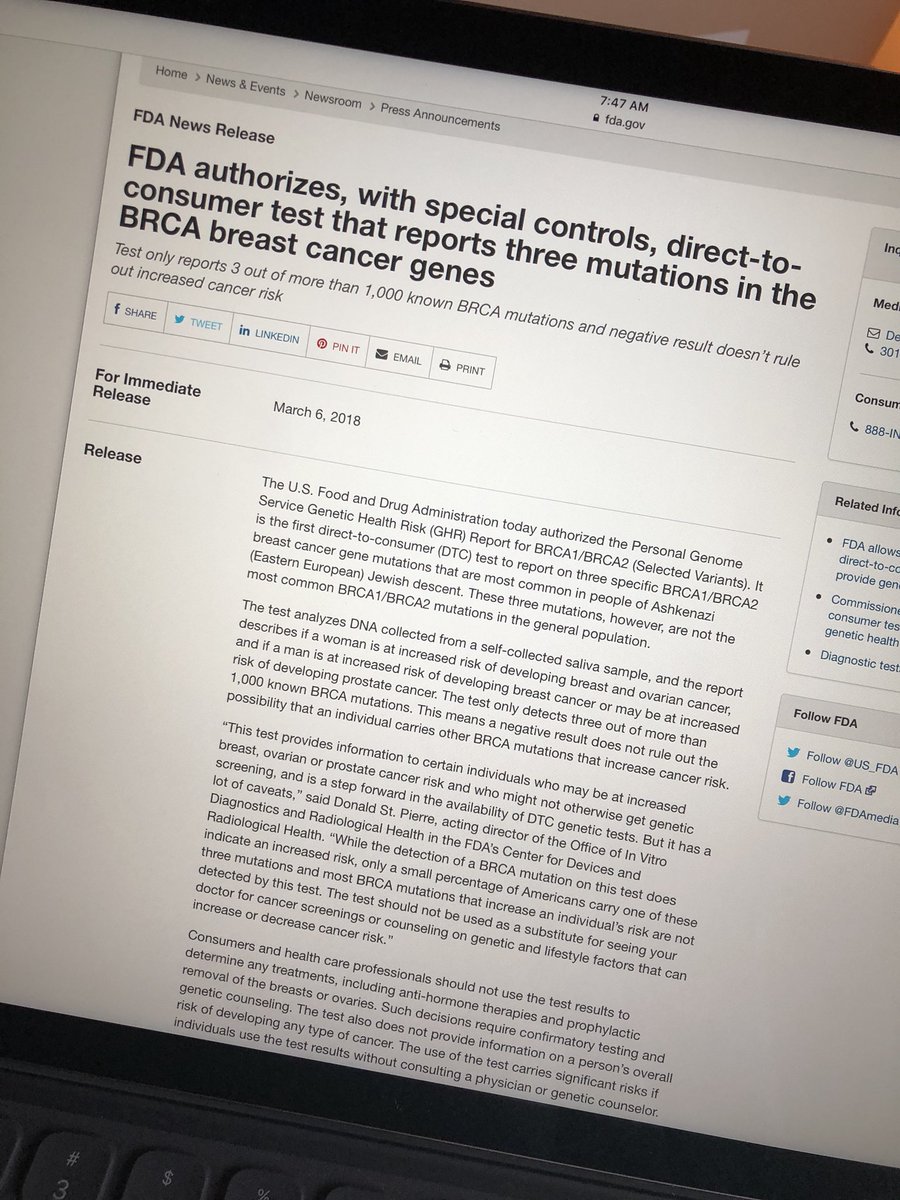 First FDA authorization for DTC genetic test on cancer risk. Thank you to the FDA for hard work and progress on innovation