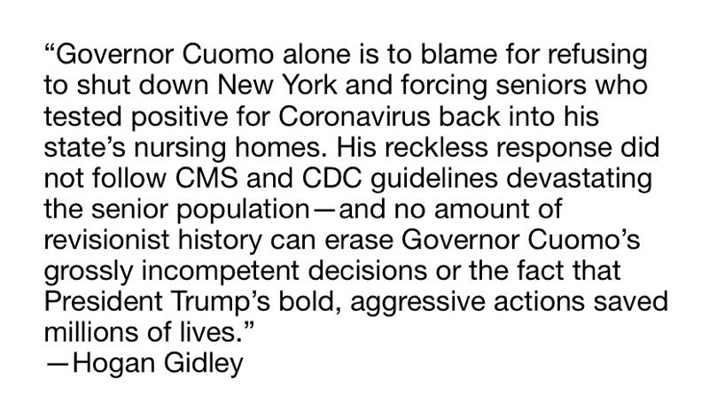 My statement regarding Governor Cuomo’s ridiculous comments attempting to shift blame and erase his direct responsibility for so many precious lives lost in New York:pic.twitter.com/UGgqeNeRlp