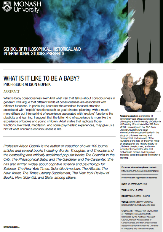 "What is it like to be a baby?" Public talk by Alison Gopnik at the Melbourne State Library Sept 18 http://events.arts.monash.edu/alisongopnik