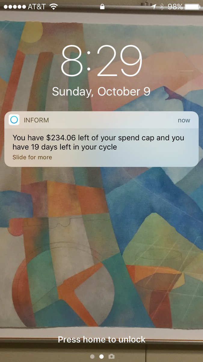 @CapitalOneLabs Inform budgeting app. This morning's notification. Very@getMoven like#UXpic.twitter.com/xxX3MIDmZ1