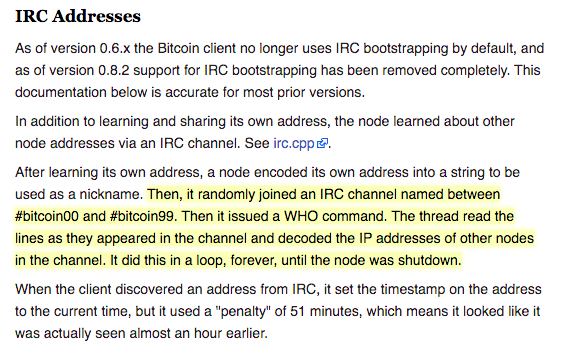This is really cute. Every Bitcoin node needs to connect to the P2P network when it first launches—but how do you find your first peer? Well back in 2012, Bitcoin software would connect to a random IRC channel between