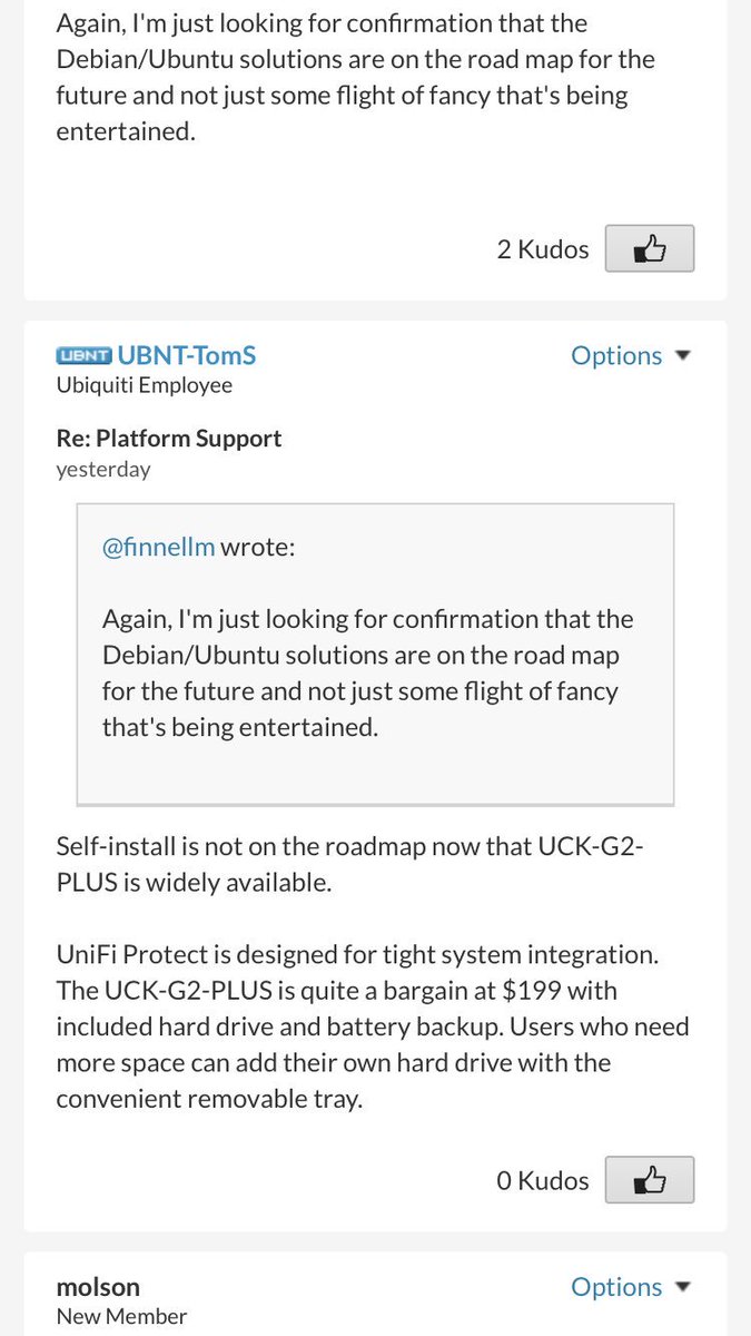 @RobertPera https://community.ubnt.com/t5/UniFi-Protect/Platform-Support/td-p/2516008/page/7 … Looks like your customers are very vocal about this- and you have locked the place for feedback on it. :( When the market is saturated with crappy DVR solutions, closing this system doesn't make people want to move to UBNT.Thanks. Twitter will use this to make your timeline better. UndoUndo -