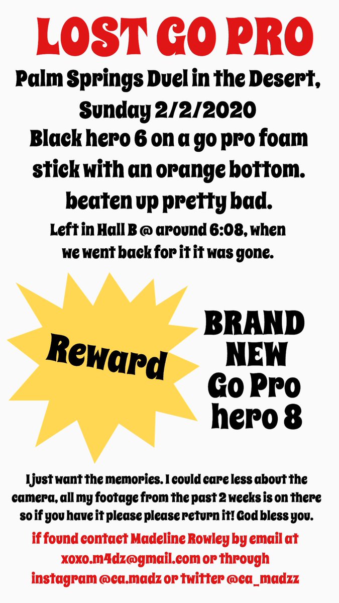 @ whoever stole my go pro in palm springs duel in the desert please return it. all I want is the footage I’ll literally let you keep the camera I just want to remember this weekend forever
