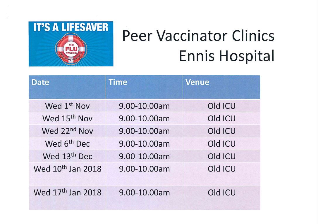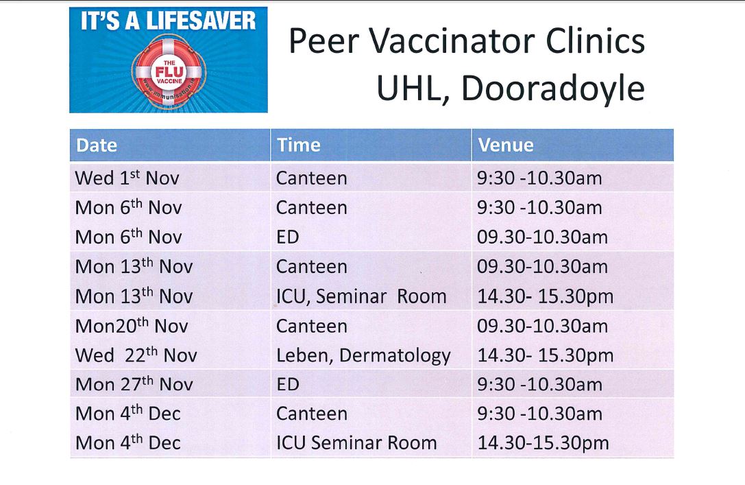 Flu Campaign: Details of Peer Vaccination Clinics this winter for Ennis UHL and Maternity staff Protect our patients