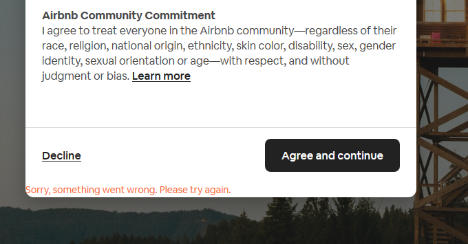 #airbnb as the 'Agree and continue' button on multiple browser throws error.@AirbnbHelp help@Airbnbpic.twitter.com/zbGsbOMGfo