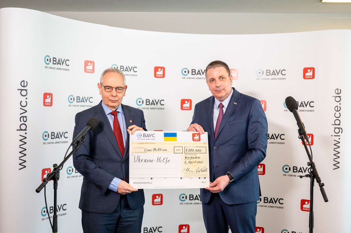 #igbce und@BAVChemie: Wir haben eine Spende von einer Million Euro verabredet, um die Initiative von@hubertus_heil zu unterstützen, Qualifikationen von Geflüchteten aus der#Ukraine schneller anzuerkennen und verstärkt Sprachkurse anzubieten.#chemie22pic.twitter.com/AmgHsgn9gE