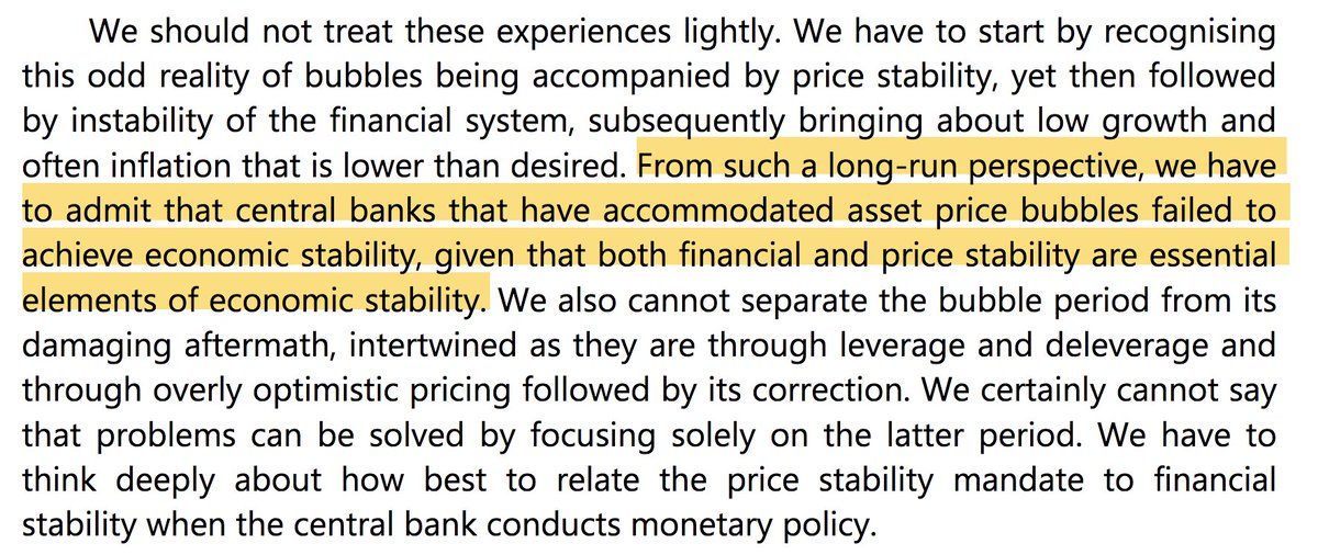 5/ Here it is in his own words, an extremely influential central banker: "we have to admit that central banks that have accommodated asset price bubbles *failed to achieve economic stability*" Regardless of what you think of central bankers, admitting this is quite brave!pic.twitter.com/TtBMiL9Uod