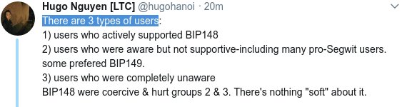 Now I'm not going to say there weren't exceptions to this, but those who supported Segwit, and opposed BIP148 of their own decision-making (ie, not simply deferring to "whatever Core does") were a very small group.