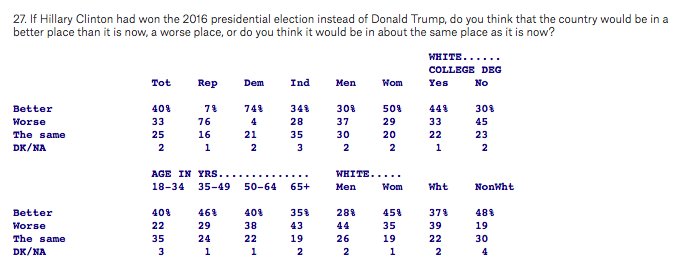 If Clinton won 2016 election, would U.S. be better off? 40% say yes, 33% say no, 25% say it’d be the samepic.twitter.com/AsHkUmnKHD