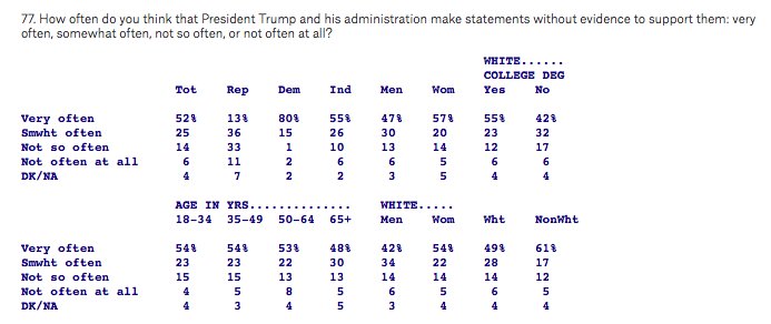 77% of voters (incl 49% of Repubs) say Trump and his administration make statements without evidence “very” or “somewhat often"pic.twitter.com/HtrlLyMRcZ