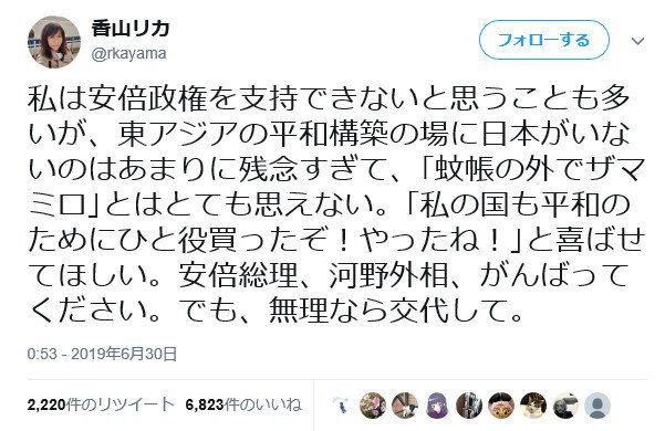 あっちょんぶりけ('ω') うっかり凄いもの見てしまった。 しばき隊(現 C.R.A.C)系文化人の香山リカ氏。 https://twitter.com/rkayama/status/1145238954959970305 … … 「安倍総理、河野外相、がんばってください」もさることながら「東アジアの平和構築の場に日本がいないのはあまりに残念すぎて、蚊帳の外でザマミロ」とは思えない」。pic.twitter.com/e99p0fCsl8